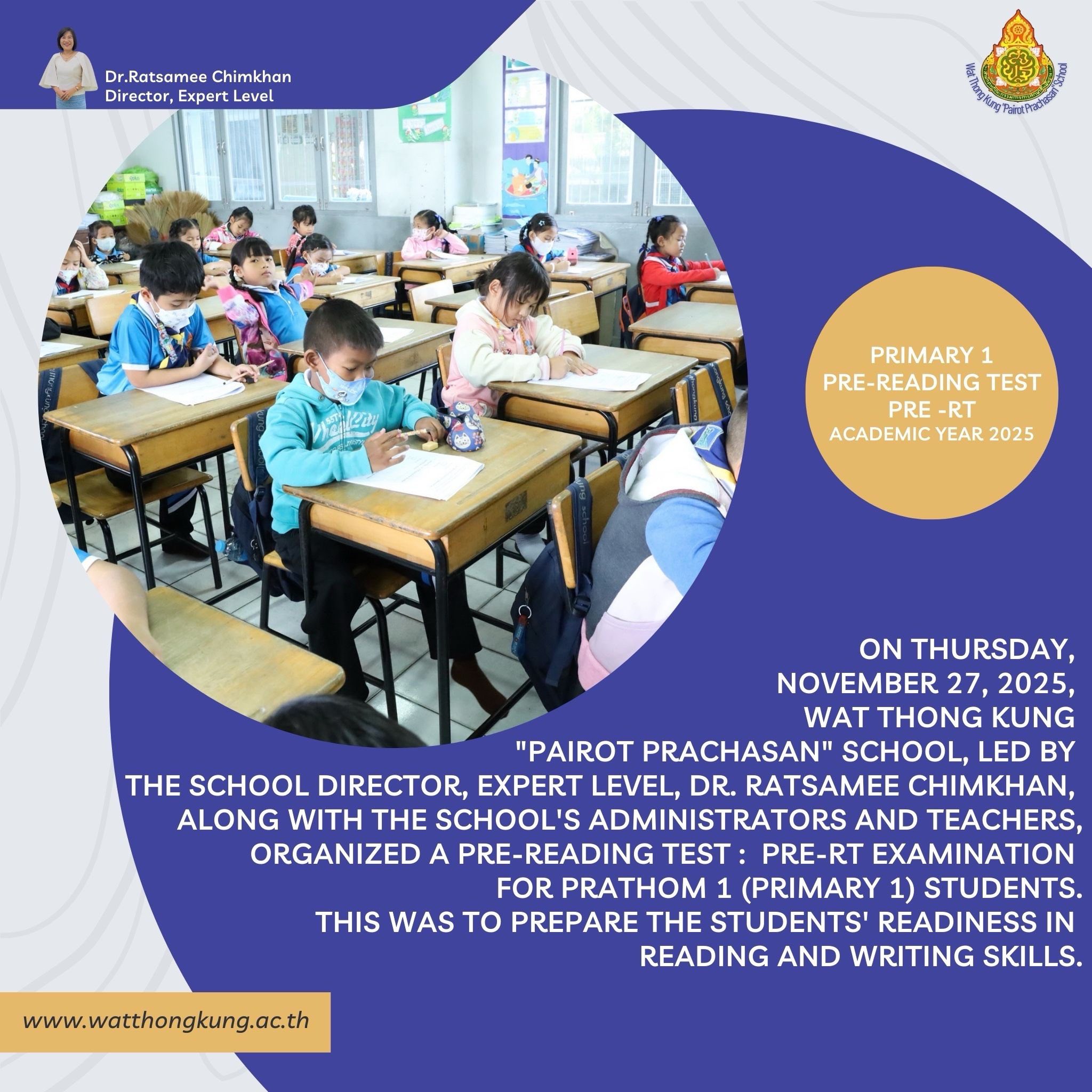 เมื่อวันที่ 27 พฤศจิกายน 2568 การสอบ Pre-RT ของนักเรียนชั้นประถมศึกษาปีที่ 1 โรงเรียนวัดท้องคุ้ง “ไพโรจน์ประชาสรรค์” ได้ดำเนินการจัดสอบ Pre RT ชั้นประถมศึกษาปีที่ 1 โดยมีวัตถุประสงค์เพื่อเตรียมความพร้อมให้เกิดความตระหนักและเห็นความสำคัญของการสอบมากขึ้น