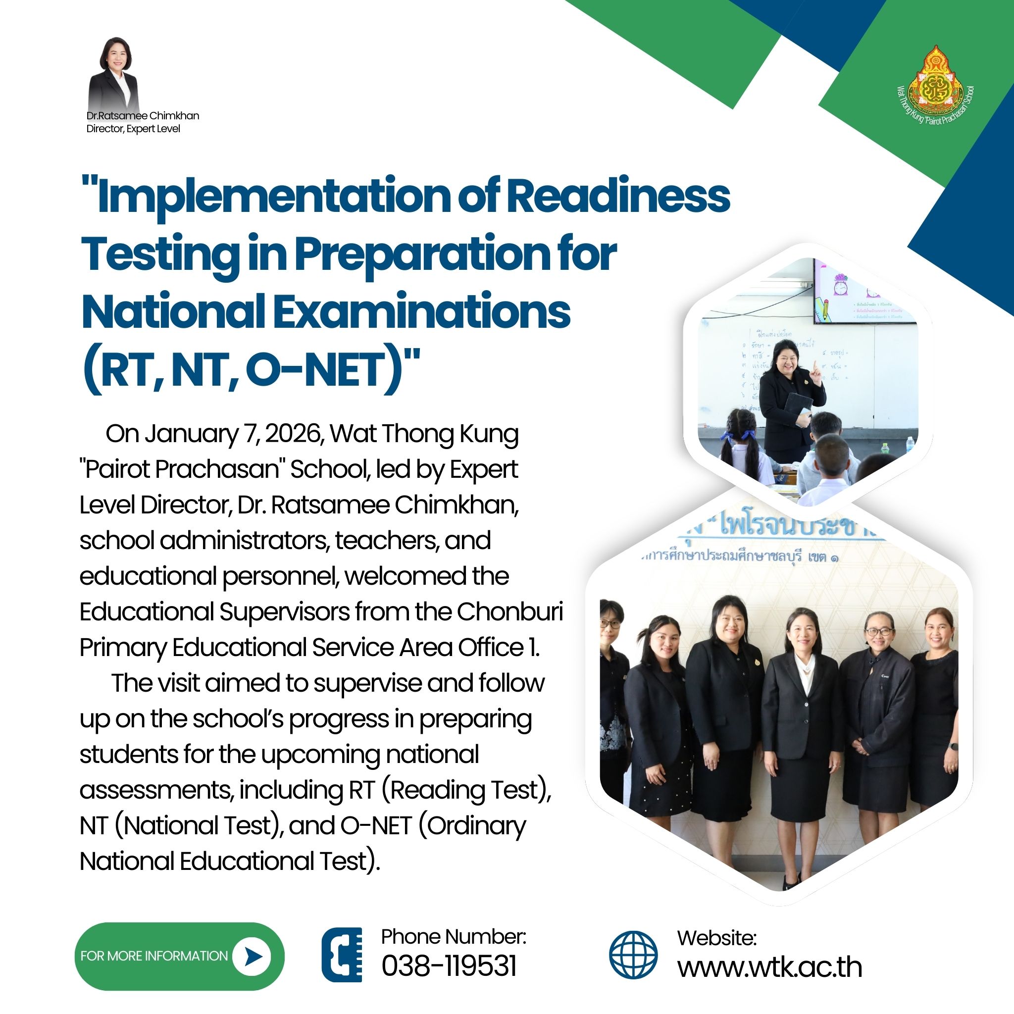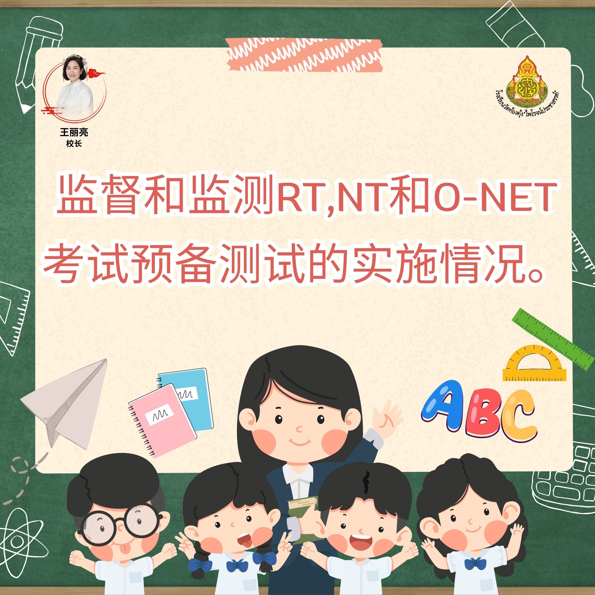 นิเทศ ติดตาม การดำเนินการทดสอบเพื่อเตรียมความพร้อมการทดสอบ RT NT และ O-NET วันที่ 7 มกราคม 2569 โรงเรียนวัดท้องคุ้ง”ไพโรจน์ประชาสรรค์” นำโดย ดร.รัศมี ฉิมขันธ์ ผู้อำนวยการโรงเรียน พร้อมทั้งคณะผู้บริหารให้การต้อนรับคณะกรรมการการนิเทศ ติดตาม การดำเนินการทดสอบเพื่อเตรียมความพร้อมการทดสอบ RT NT และ O-NET ซึ่งมี ว่าที่ร้อยตรีเกษมศานต์ อาปะโม รองผู้อำนวยการสพป.ชลบุรี เขต 1 ศน.ศุภวรรณ จันทราเขต, ศน.จารุวรรณ เฉลิมวงค์ และศน.มัสยา เมืองมูล สำนักงานเขตพื้นที่การศึกษาประถมศึกษาชลบุรี เขต 1 คณะกรรมการเยียมชมท้อมห้องเรียน เพื่อให้กำลังใจคณะครูและนักเรียนโรงเรียนวัดท้องคุ้ง”ไพโรจน์ประชาสรรค์” การนิเทศน์ครั้งนี้เป็นไปด้วยความเรียบร้อยดี