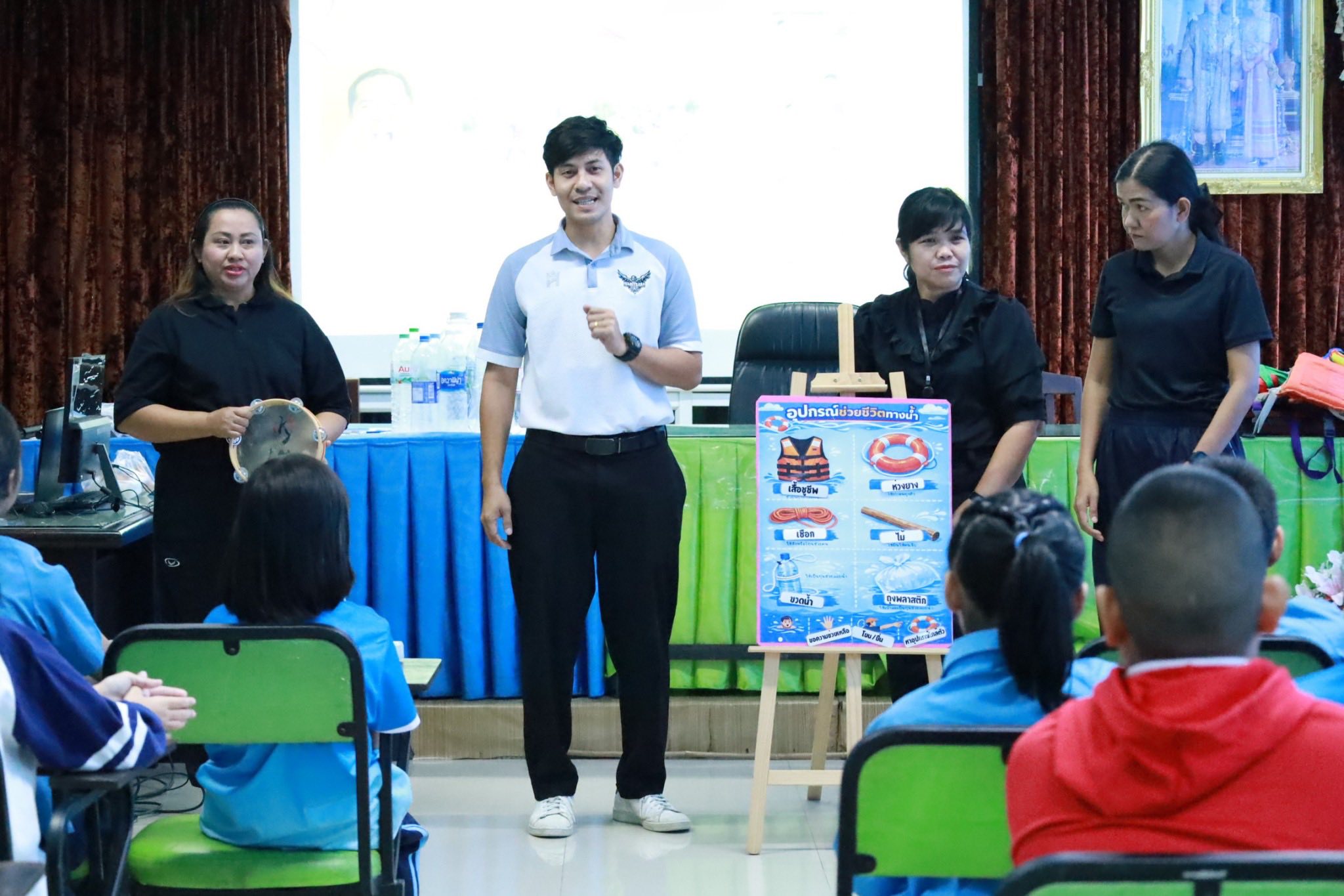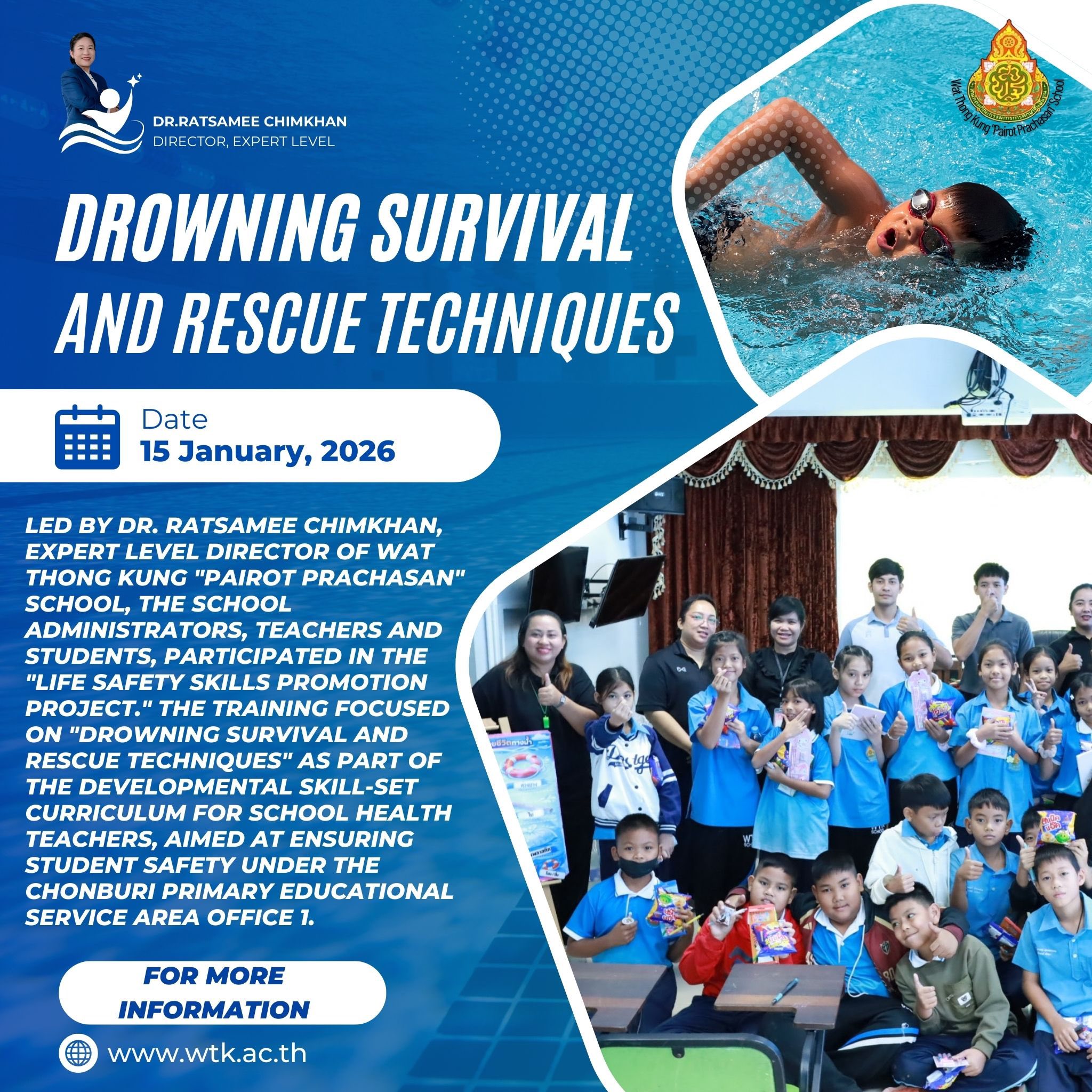 วันพฤหัสบดีที่ 15 มกราคม โรงเรียนวัดท้องคุ้ง”ไพโรจน์ประชาสรรค์” นำโดย ดร.รัศมี ฉิมชันธ์ ผู้อำนวยการโรธเรียน พร้อมกับคณะผู้บริหาร คณะครู บุคลากรทางการศึกษา ได้นำนักเรียนเข้าร่วมโครงการการเสริมทักษะชีวิตปลอดภัย ในเรื่องการเอาตัวรอดในน้ำและการช่วยเหลือผู้จมน้ำ โดยกิจกรรมนี้เป็นส่วนหนึ่งของโครงการฝึกอบรมเพื่อพัฒนาทักษะสำหรับครูอนามัยโรงเรียน เพื่อเพิ่มความปลอดภัยของนักเรียน ภายใต้การดูแลของสำนักงานเขตการศึกษาประถมศึกษา ชลบุรี 1