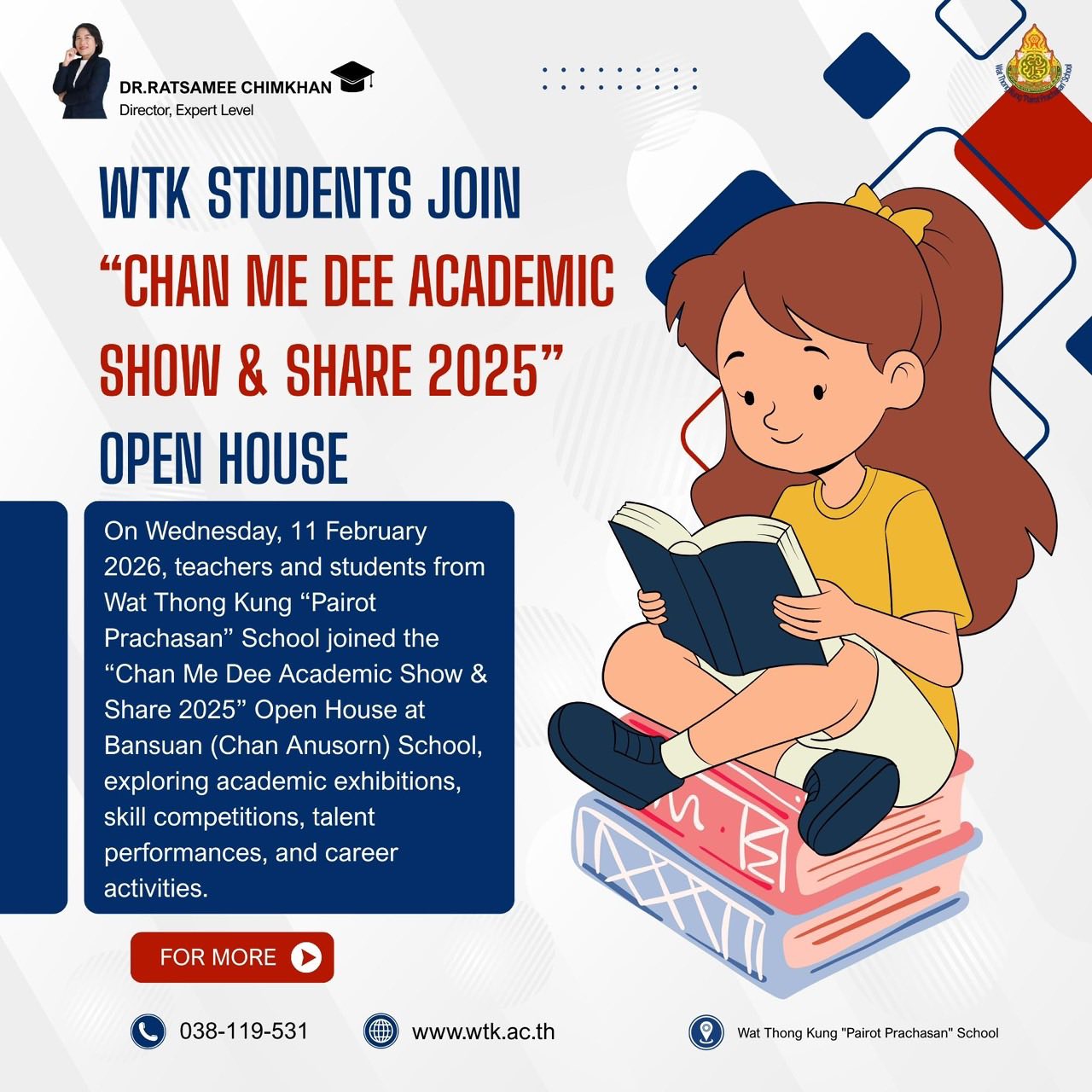 โรงเรียนวัดท้องคุ้ง“ไพโรจน์ประชาสรรค์ ได้นำนักเรียนระดับชั้นประถมศึกษาปีที่ 6 และนักเรียนระดับชั้นมัธยมศึกษาปีที่ 3 เข้าร่วม “กิจกรรม Academic Show & Share 2026 โดยมีการจัดนิทรรศการทางวิชาการ,นิทรรศการและการนำเสนอโครงงาน IS ระดับม.2 และ ม.5 กิจกรรมงานขาย และการแข่งขันทักษะทางวิชาการ ณ อาคาร ร่มสนนฤมิต
