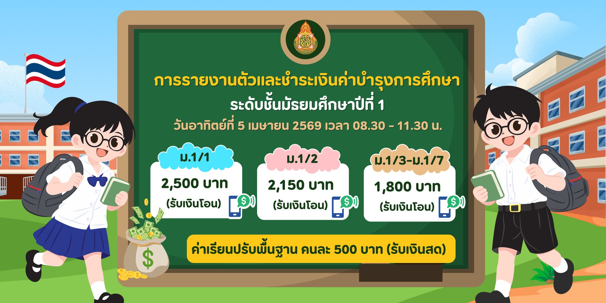 การรายงานตัวและชำระเงินค่าบำรุงการศึกษา ระดับชั้นมัธยมศึกษาปีที่ 1 ปีการศึกษา 2569