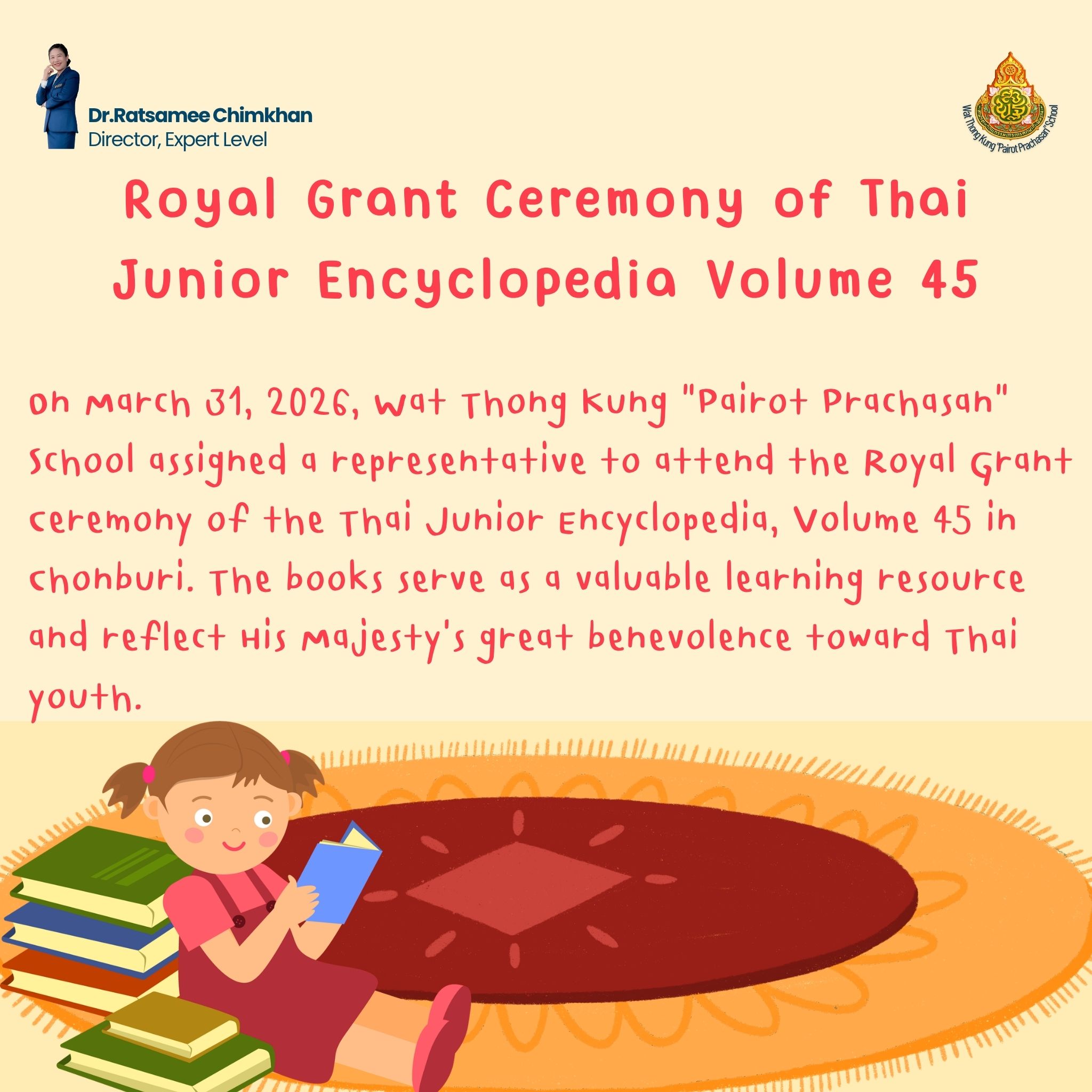 วันอังคารที่ 31 มีนาคม 2569 โรงเรียนวัดท้องคุ้ง “ไพโรจน์ประชาสรรค์” นำโดย ดร.รัศมี ฉิมขันธ์ ผู้อำนวยการโรงเรียน มอบหมายให้ นางสาวกนกพิชญ์ อ่างทอง รองผู้อำนวยการโรงเรียน เข้าร่วมพิธีรับมอบหนังสือสารานุกรมไทยสำหรับเยาวชน เล่มที่ 45 ฉบับพระราชทาน โดยมีผู้ว่าราชการจังหวัดชลบุรีเป็นประธานในพิธี ณ ศาลาประชาคมเทศบาลนครบ้านสวน อำเภอเมือง จังหวัดชลบุรี หนังสือดังกล่าวนับเป็นแหล่งเรียนรู้ที่มีคุณค่า ส่งเสริมการศึกษาของนักเรียนและเป็นพระมหากรุณาธิคุณที่ทรงมีต่อเยาวชนไทยอย่างหาที่สุดมิได้