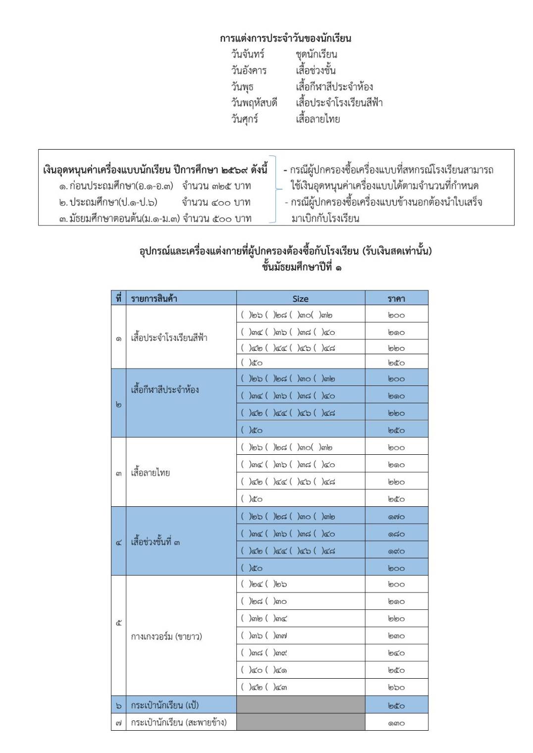 อุปกรณ์และเครื่องแบบการแต่งกายที่ผู้ปกครองต้องซื้อกับทางโรงเรียน ในวันที่ 5 เมษายน พ.ศ.2569 (รับเป็นเงินสด)