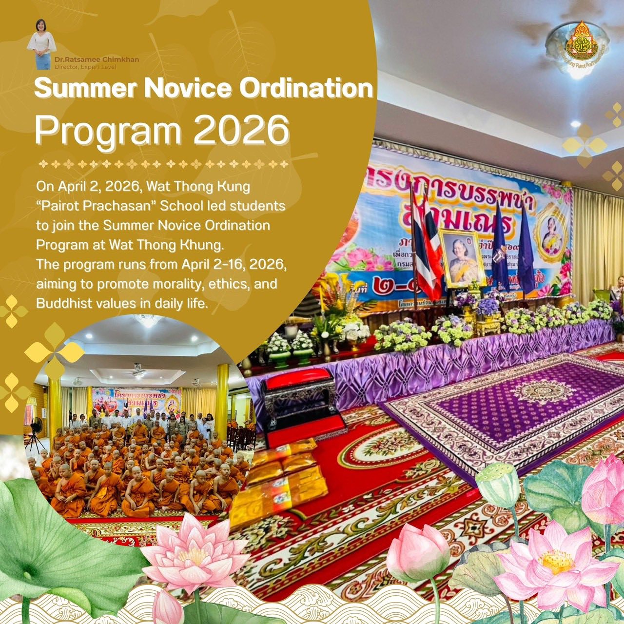 เมื่อวันที่ 2 เมษายน พ.ศ. 2569 โรงเรียนวัดท้องคุ้ง “ไพโรจน์ประชาสรรค์” นำโดย ดร.รัศมี ฉิมขันธ์ พร้อมคณะครู ร่วมกับพระอาจารย์ เจ้าอาวาสวัดท้องคุ้ง เจ้าคณะตำบลหนองรี นำนักเรียนเข้าร่วมโครงการบรรพชาสามเณร ภาคฤดูร้อน โครงการจัดขึ้นระหว่างวันที่ 2 – 16 เมษายน พ.ศ. 2569 เพื่อส่งเสริมคุณธรรม จริยธรรม และปลูกฝังคุณค่าทางพระพุทธศาสนา ทั้งนี้ โครงการดังกล่าวมุ่งเน้นให้นักเรียนได้เรียนรู้หลักธรรมและนำไปประยุกต์ใช้ในชีวิตประจำวันอย่างเหมาะสม